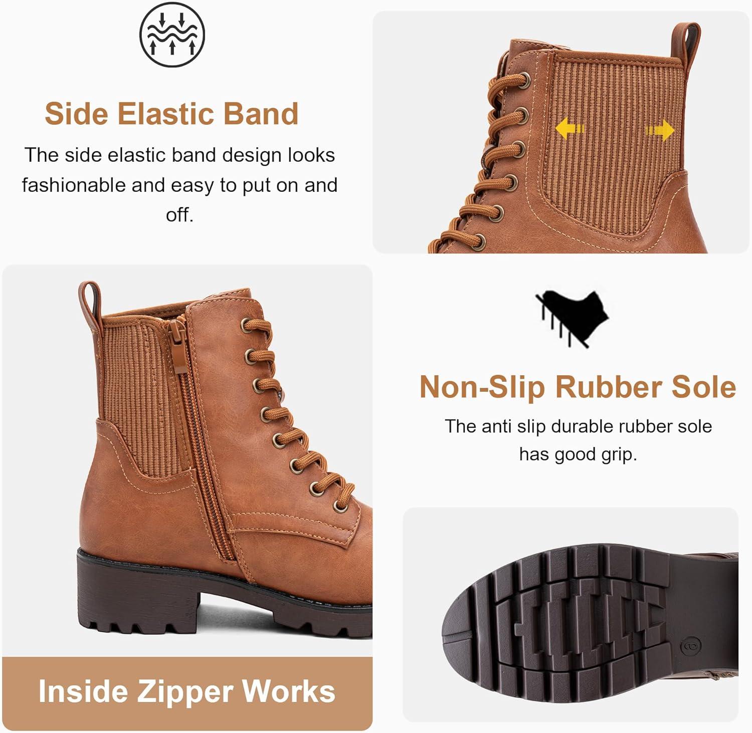 Vepose Women’s Ankle Boots, Combat Lace up Booties with Inside Zipper(Brown)