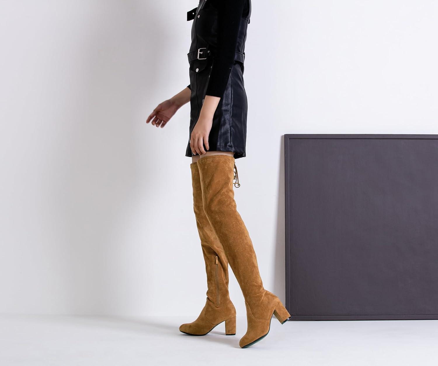 Vepose Women's Aria Thigh High Over The Knee Boots, Cute Suede Long Boots with High Heel and Inner Zipper(Khaki)