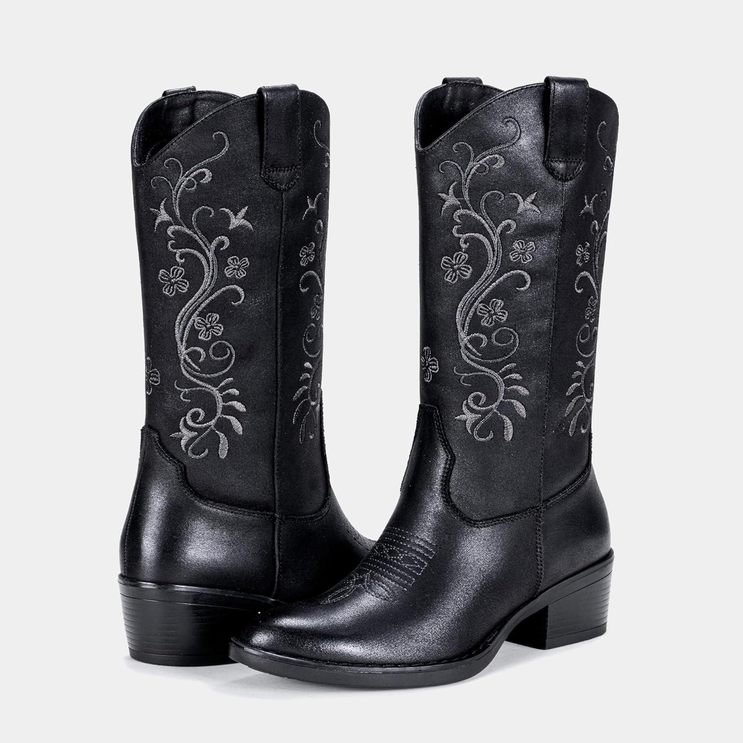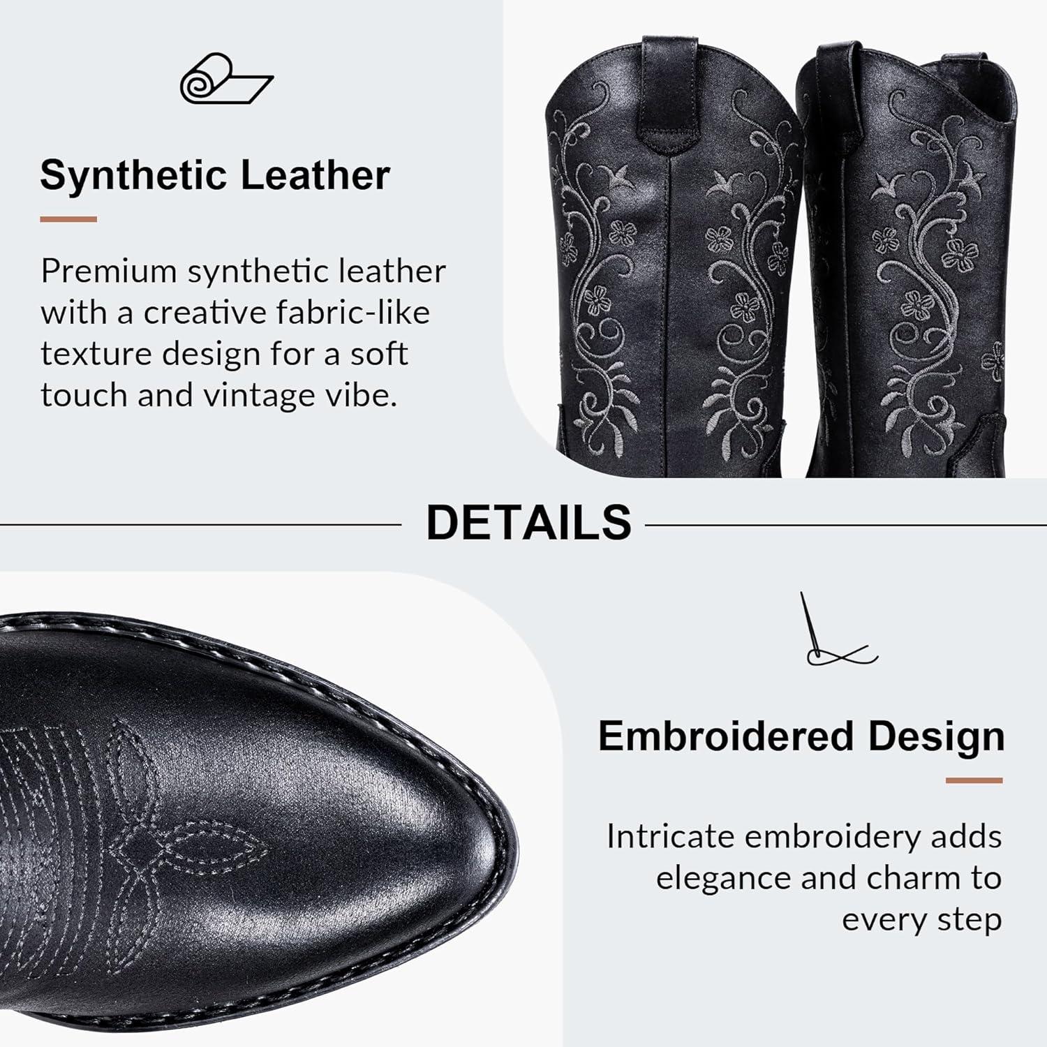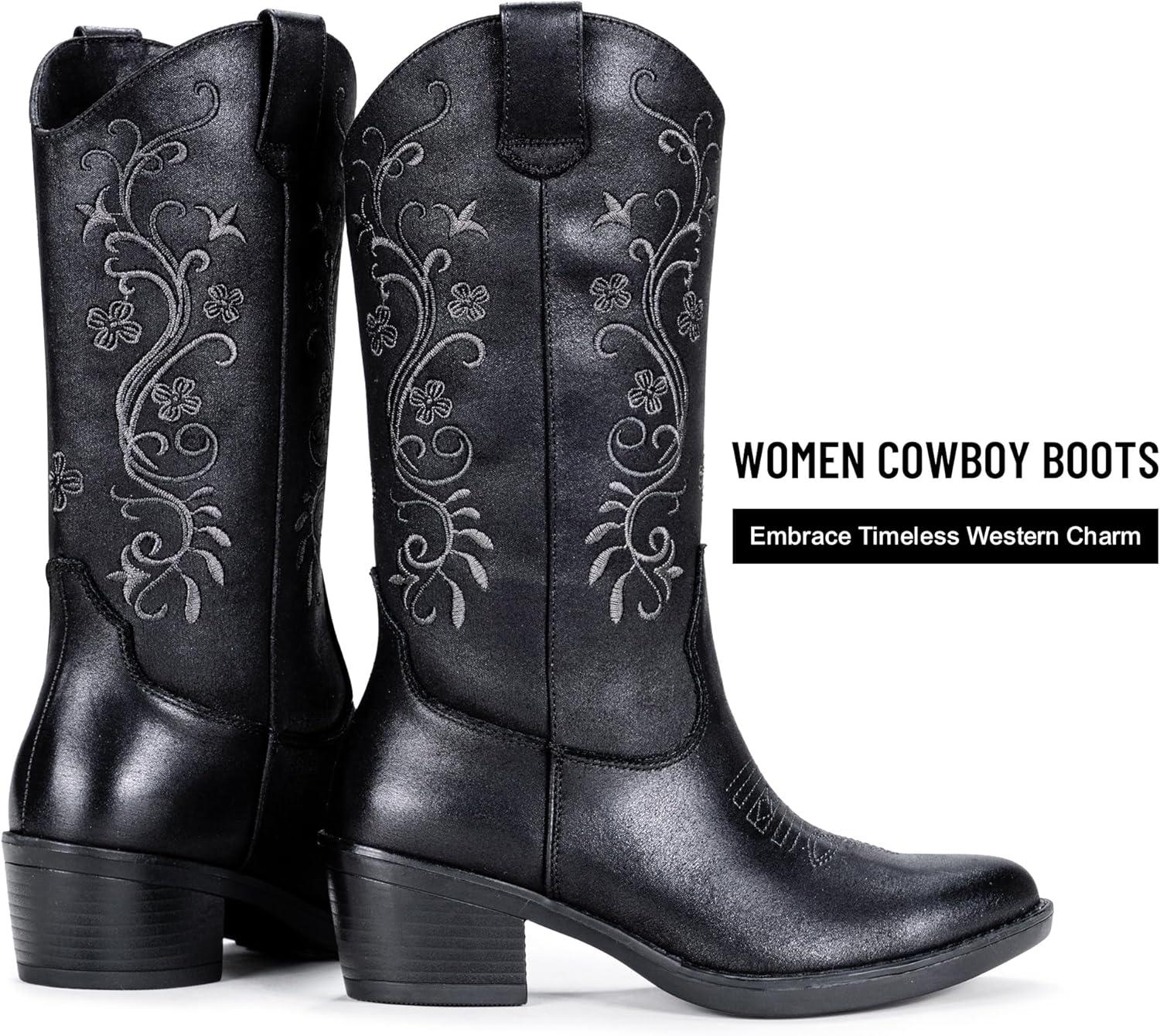 Vepose Women’s Cowboy Boots, Embroidered Western Mid-Calf 9802 Cowgirl Boots, Pointed Toe Pull on Boots with Chunky Heel(Classic-9802-black)
