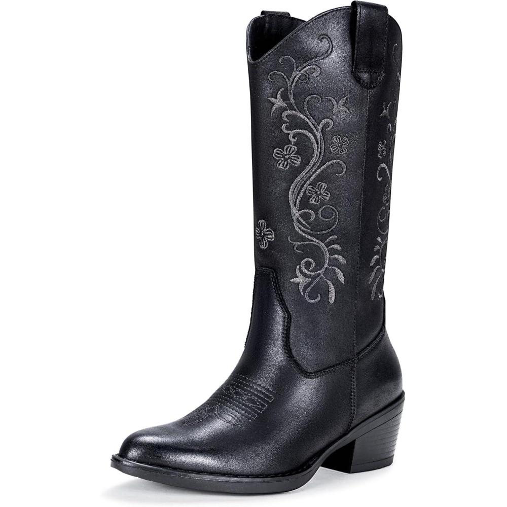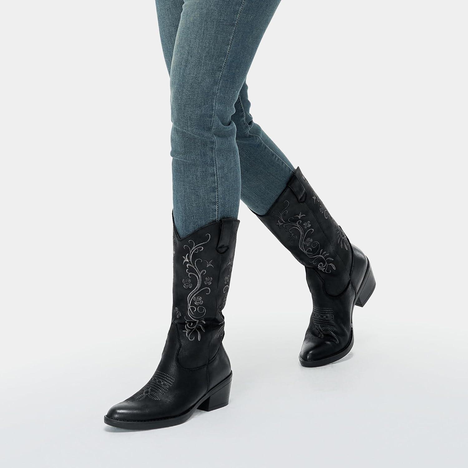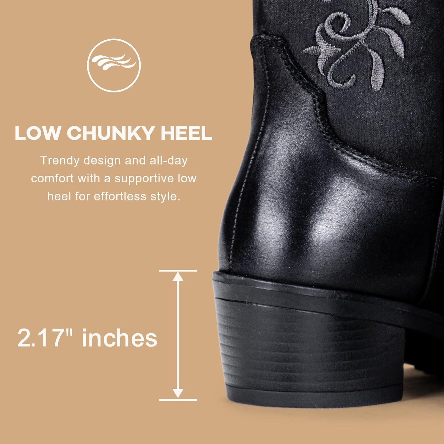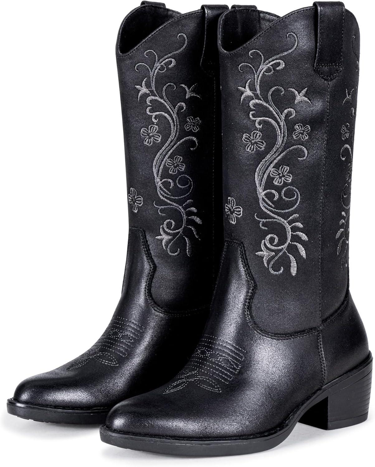 Vepose Women’s Cowboy Boots, Embroidered Western Mid-Calf 9802 Cowgirl Boots, Pointed Toe Pull on Boots with Chunky Heel(Classic-9802-black)
