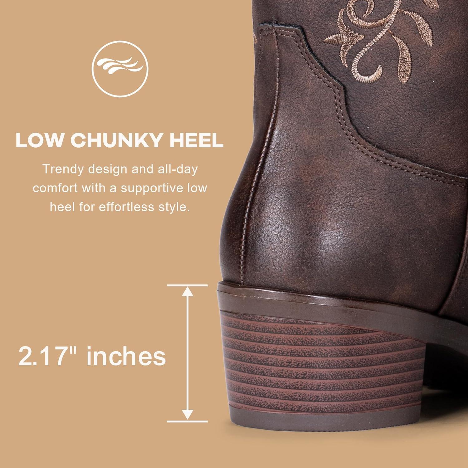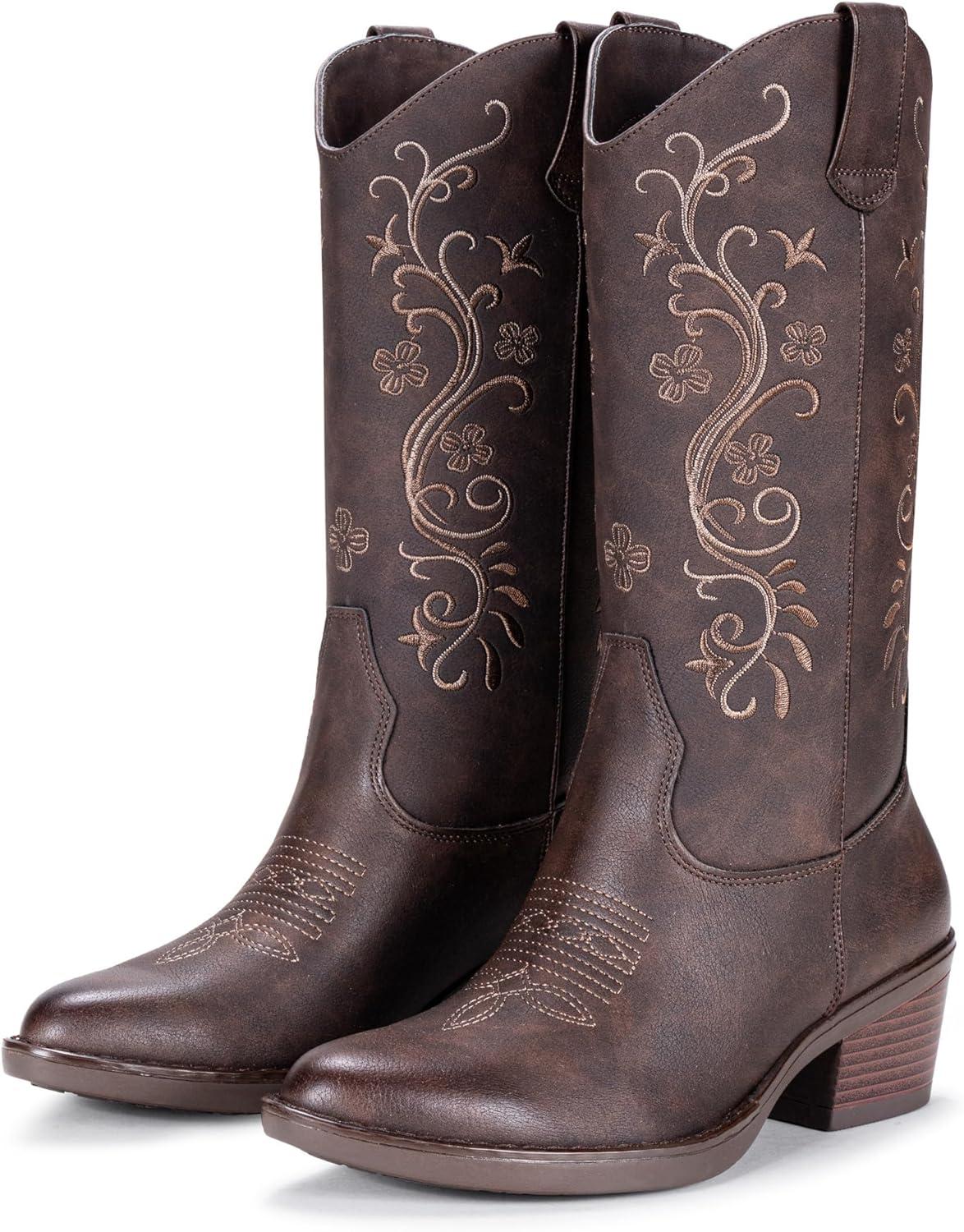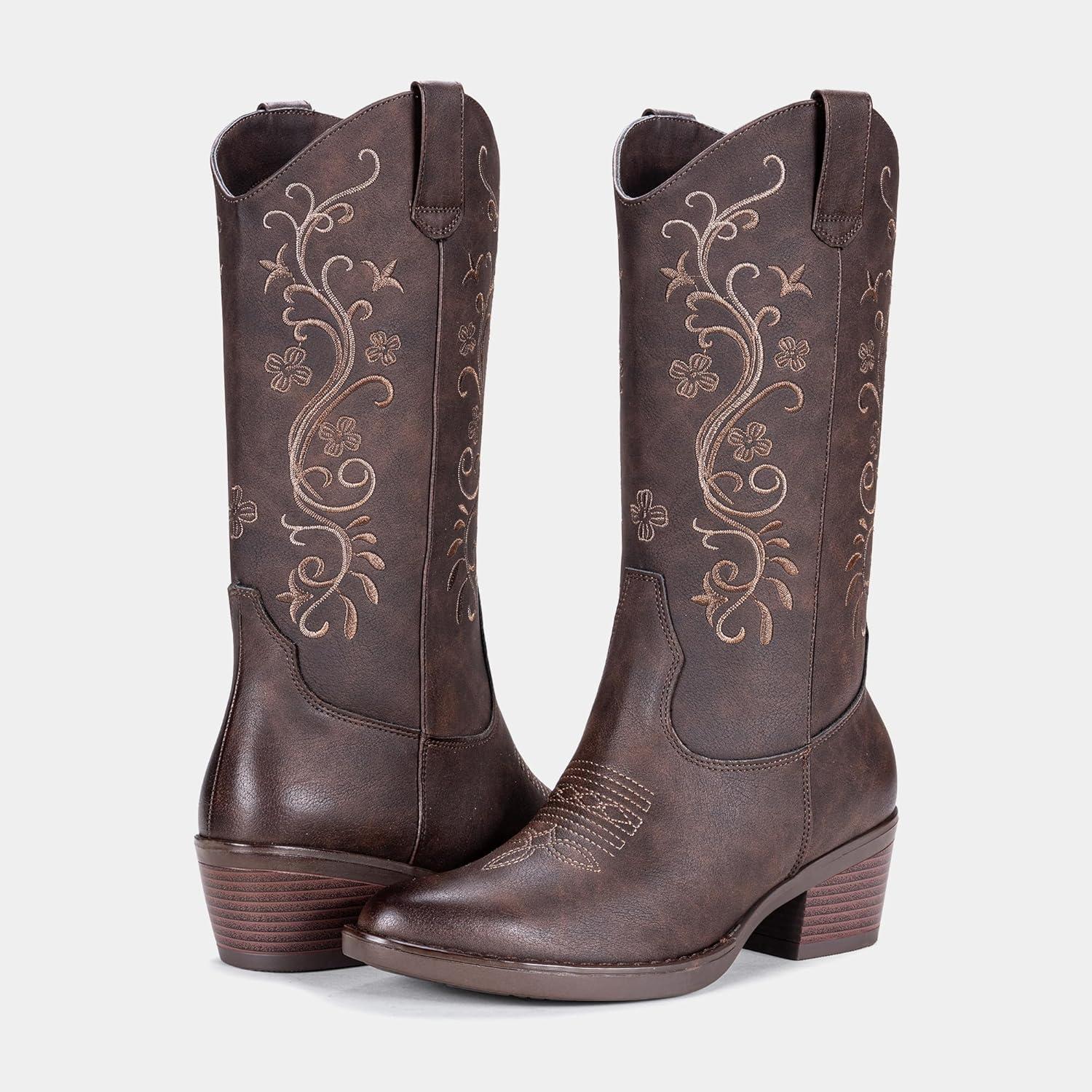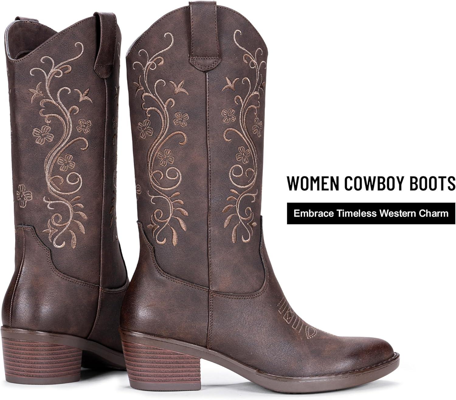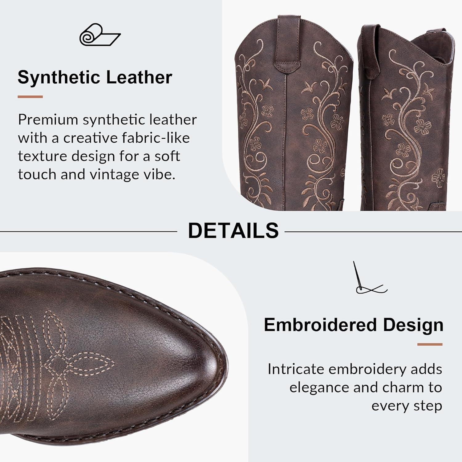 Vepose Women’s Cowboy Boots, Embroidered Western Mid-Calf 9802 Cowgirl Boots, Pointed Toe Pull on Boots with Chunky Heel(Vintage-9802-brown)