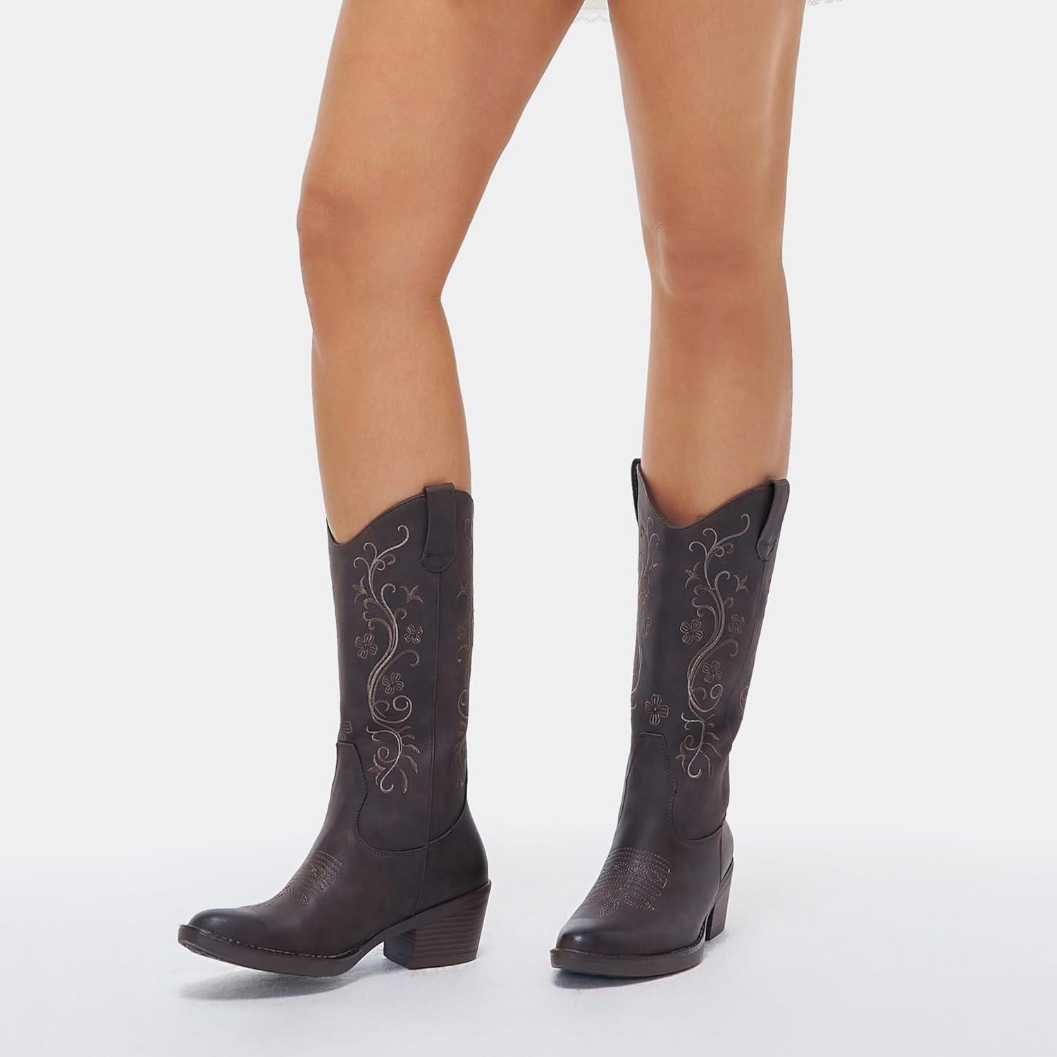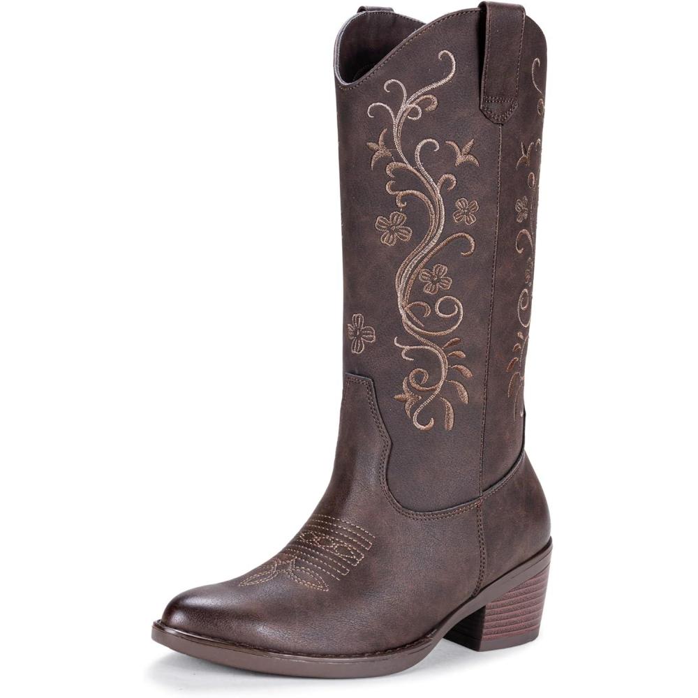 Vepose Women’s Cowboy Boots, Embroidered Western Mid-Calf 9802 Cowgirl Boots, Pointed Toe Pull on Boots with Chunky Heel(Western-9802-whisky)