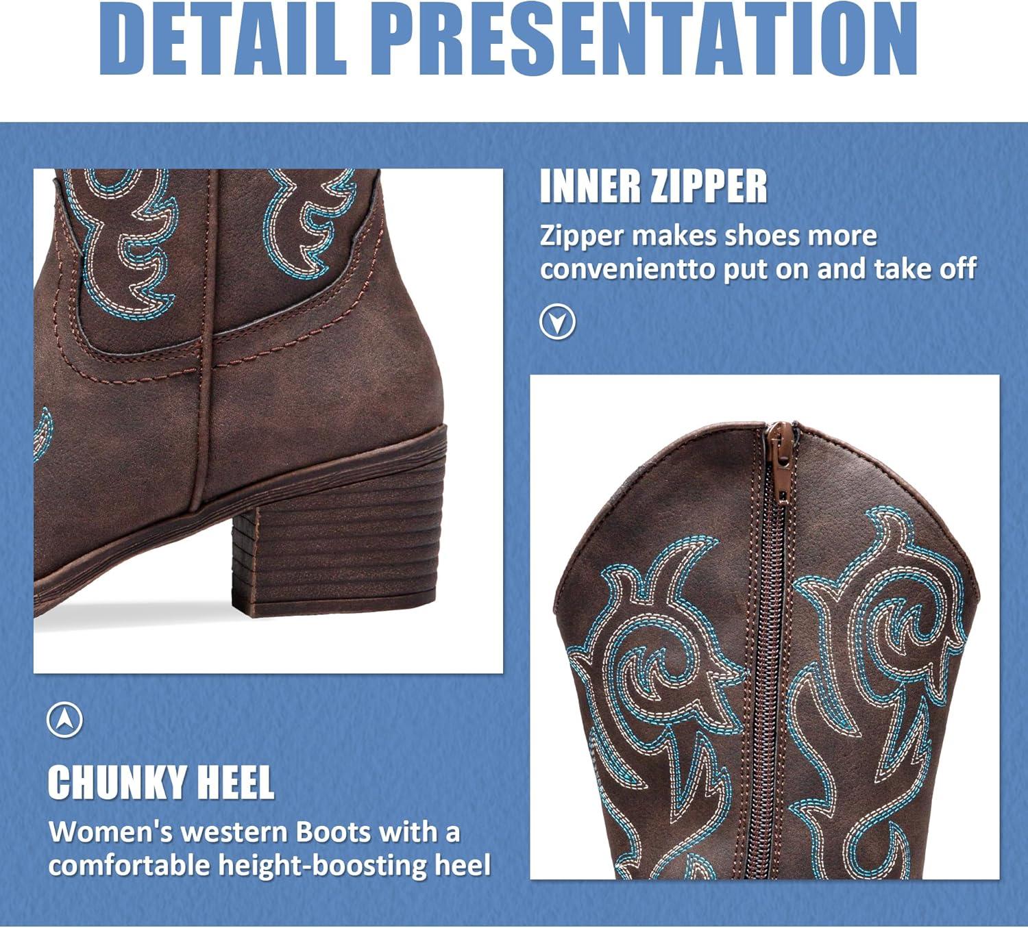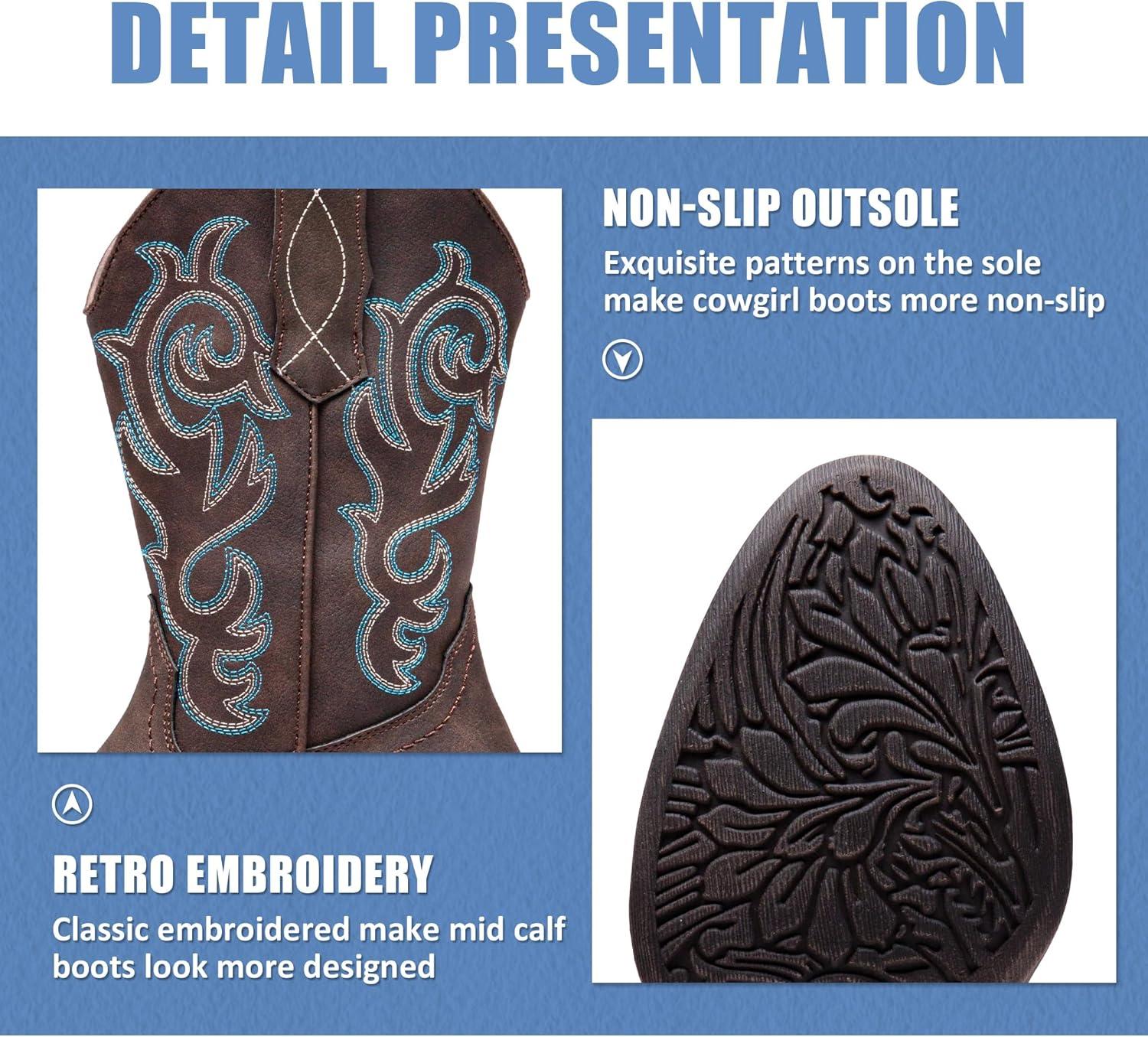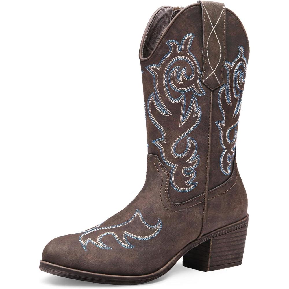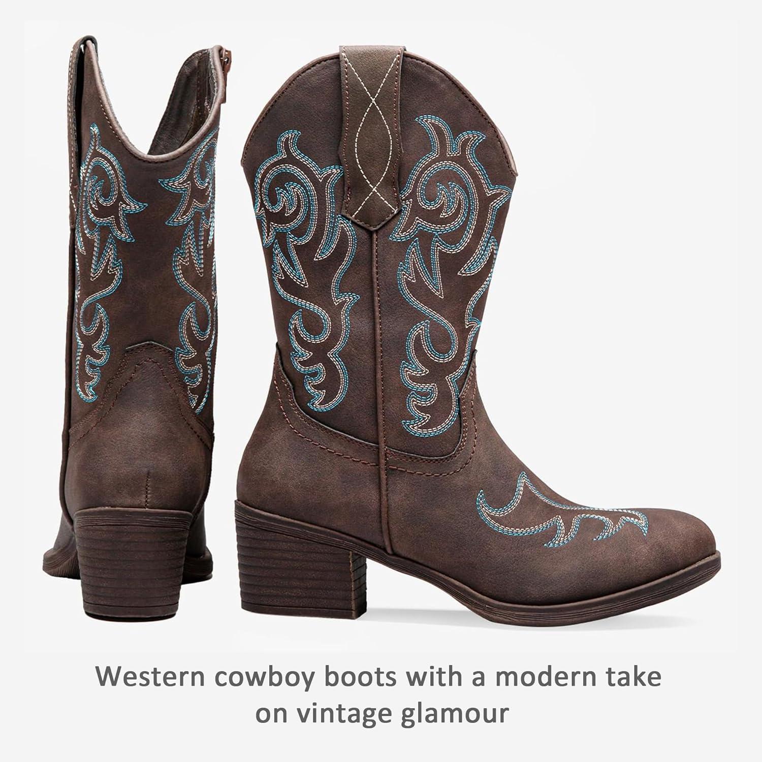 Vepose Women’s Cowboy Mid Calf Boots Cowgirl Western Embroidered Chunky Low Heel 9800 Boots with Zipper(Dark Brown-modern Cowboy)