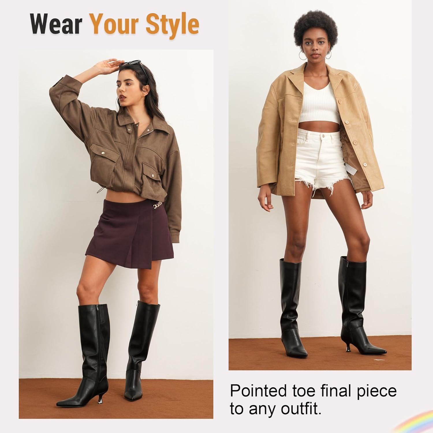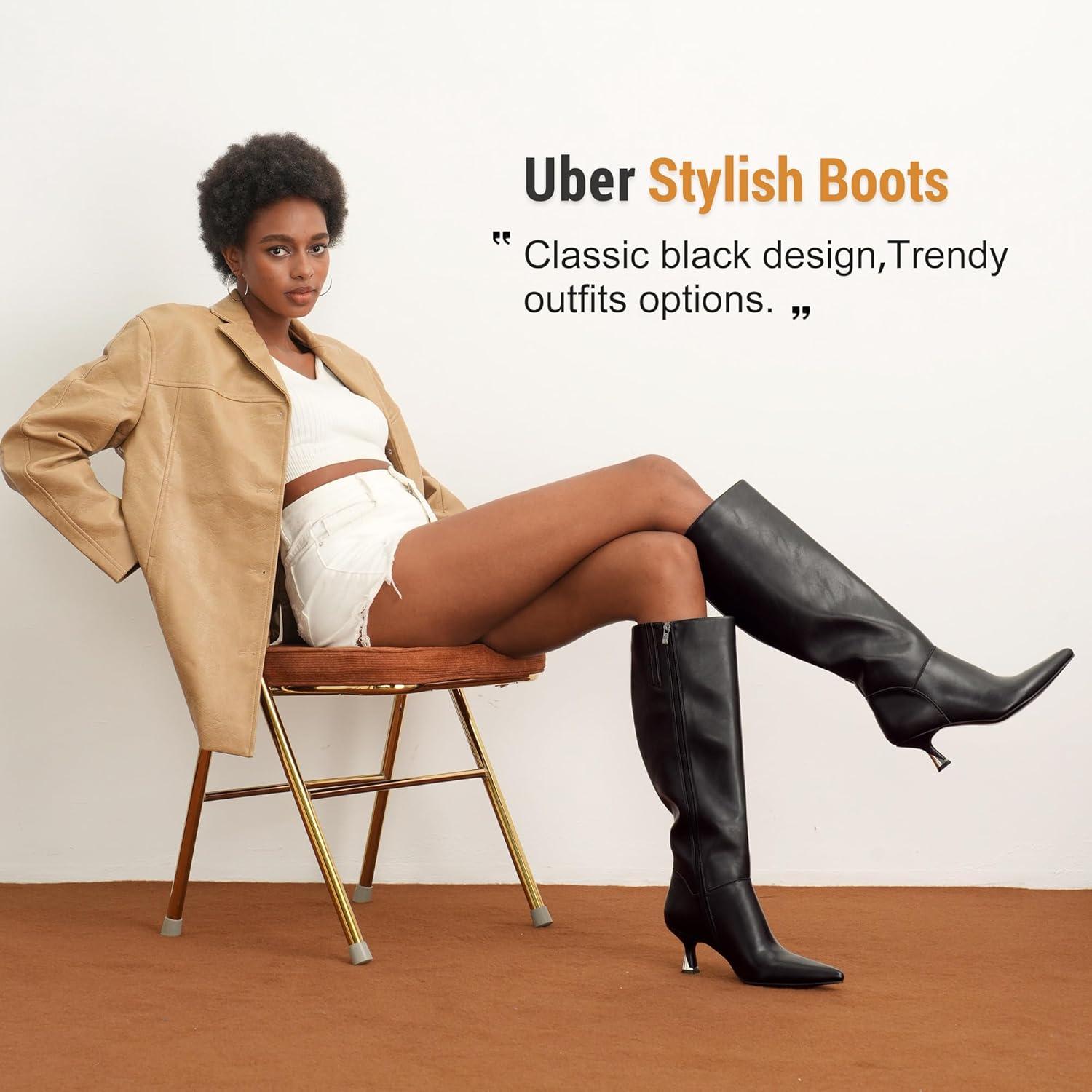 Vepose Women’s Knee High Tall Faux Leather Boots, Pointed Toe Kitten Heeled Dress Ladies Fashion Riding 9525 Boots with Side Zipper, Elegantes Casual Comfort Botas Trendy para Mujer(Black)