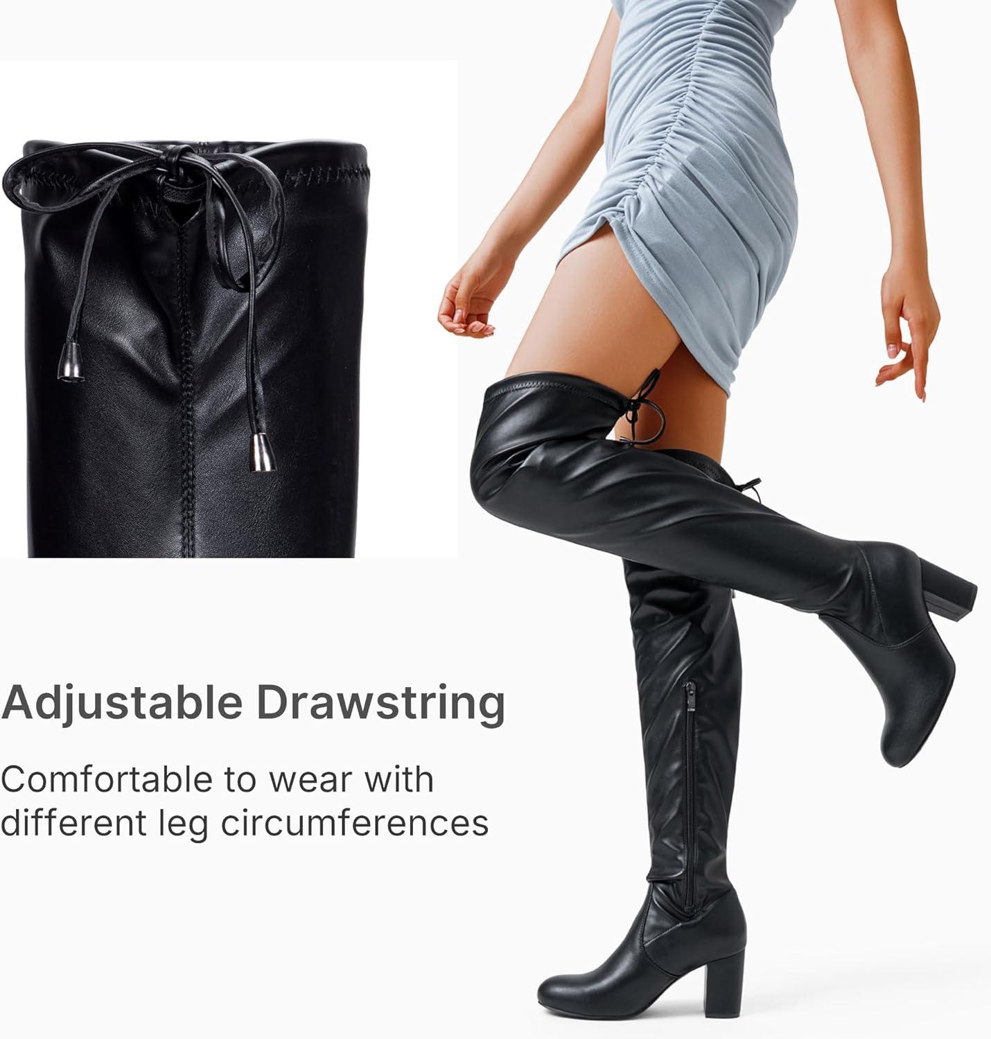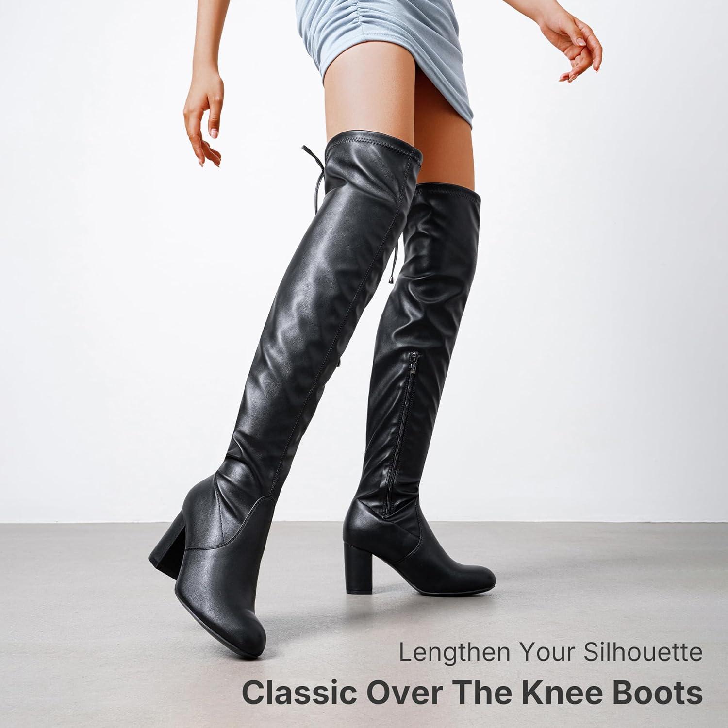 Vepose Women's Over The Knee High Boots Suede Thigh High Boot 3 Inch Chunky Heels Zipper Adjustable Opening Shoes(Black Pu)
